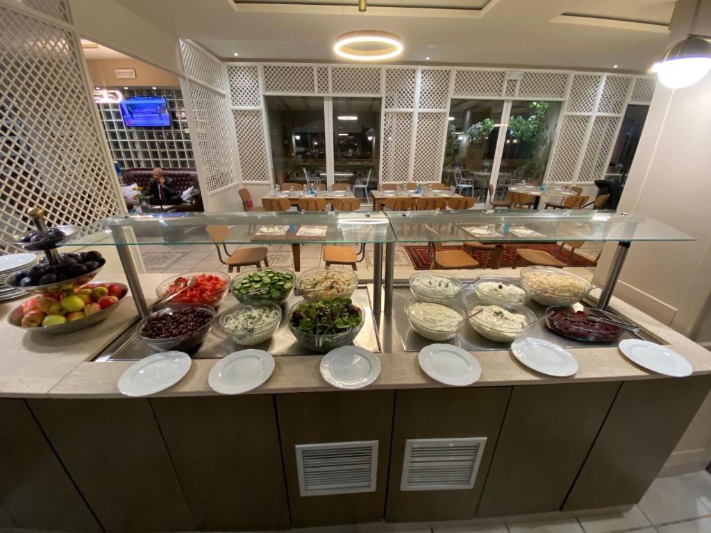 Hotelul include un restaurant care servește un mic dejun tip bufet, mancăruri grecești tradiționale și preparate internaționale excelente. La cafeneaua hotelului și la barul de la piscină se pot savura preparate mai ușoare.