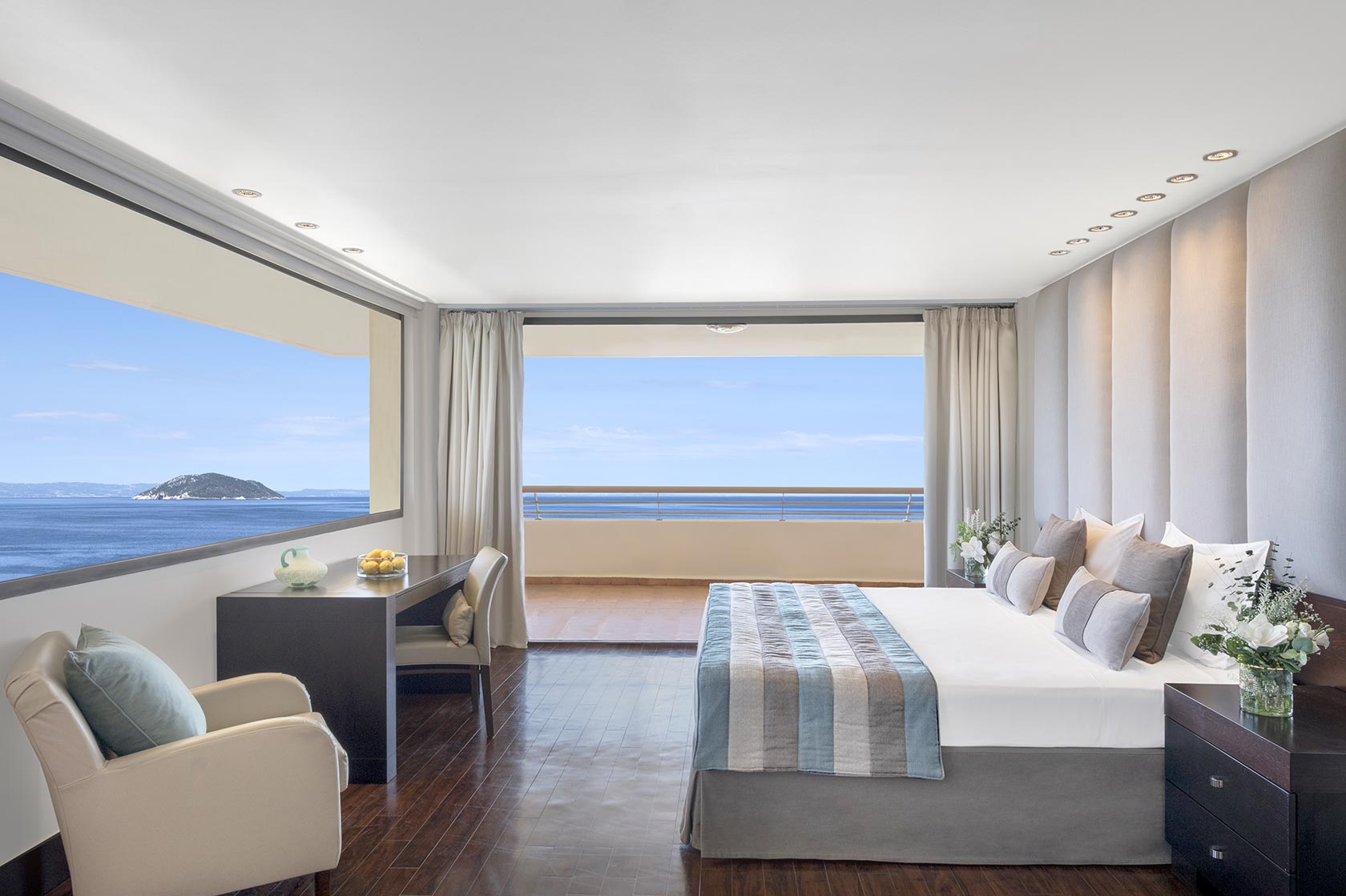 Complexul hotelier se întinde pe o suprafață generoasă, înconjurat de grădini mediteraneene și oferă acces direct la o plajă privată cu nisip fin, premiată cu Blue Flag. Oaspeții au la dispoziție camere elegante cu vedere spre mare sau grădină, majoritatea având balcoane spațioase.