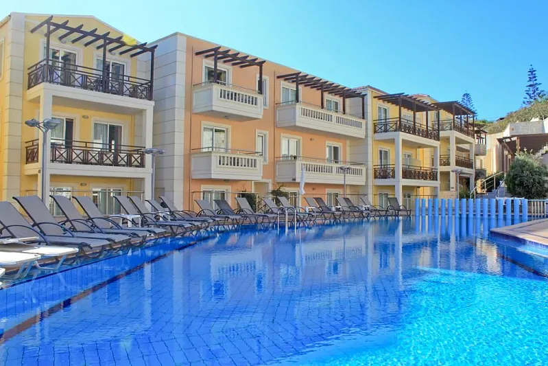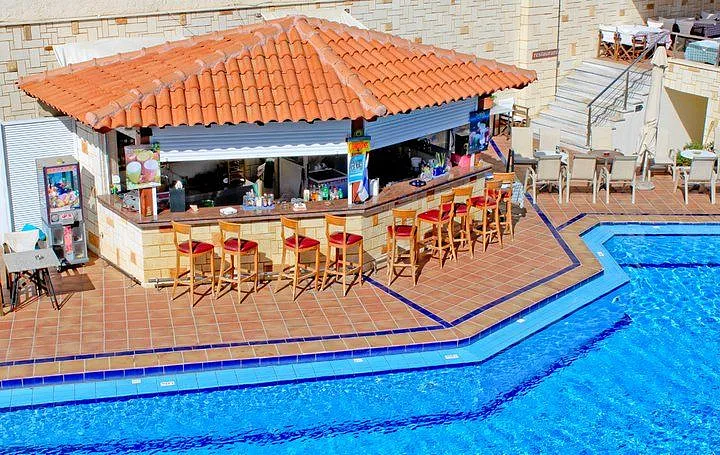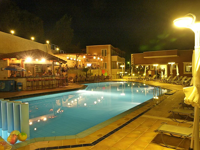 In all apartments and studios you’ll find kitchenettes, fridge, electric burners and cooking appliances, air conditioner, television, mini safe, bathroom with shower and spacious verandas with a view to the Cretan Sea or the pool. In the heart of our hotel, a large pool and a smaller one nearby are waiting our guests, offering moments of fun for adults and children, during the hot summer days, and entertaining them all day long through the night, in the atmospheric pool bar, where various events are held.