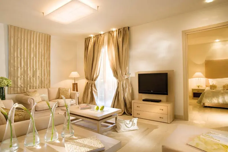 Camera Suite cu terasa sau cu balcon are un living si un dormitor separat, capacitatea maxima fiind de 2 adulti si 2 copii sau 3 adulti si 1 copil. Camera are: 2 TV satelit cu canale de muzica, DVD/CD player, iPod/Bose SoundDock, acces la internet WIFI, aer conditionat, mini bar, seif, facilitati pentru prepararea ceaiului si a cafelei, aparat de cafea Nespresso, baie cu cada, jacuzzi, cabina de dus, uscator de par, halat si papuci, terasa cu gradina sau balcon.