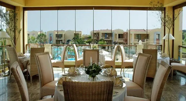 Hotelul ofera mic dejun si cina bufet. Optional se poate rezerva si pranzul bufet. Hotelul are un restaurant unde se serveste micul dejun bufet bogat si cina A la carte, un restaurant A la carte cu specific mediteranean si un restaurant in care se serveste caviar, peste afumat si crustacee. Langa piscina exista un bar care pe langa bauturi serveste si o varietate de gustari.