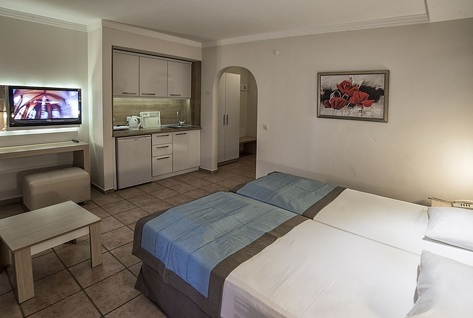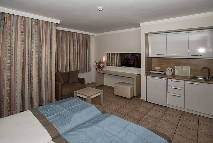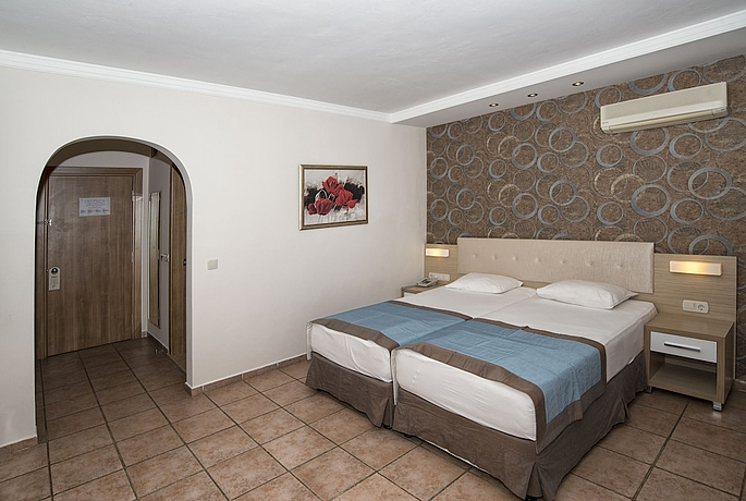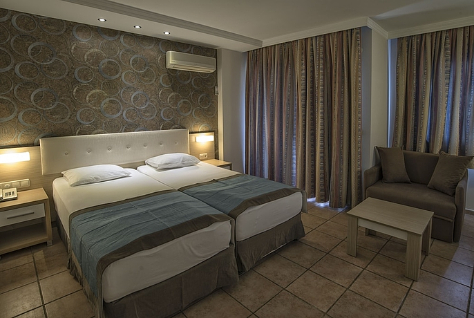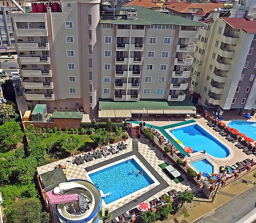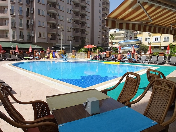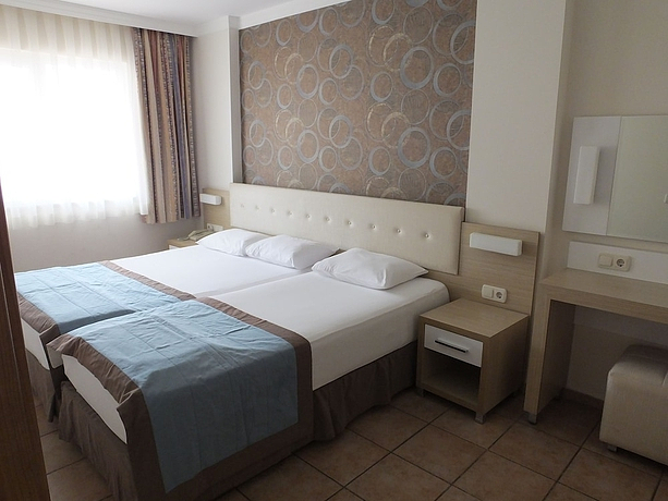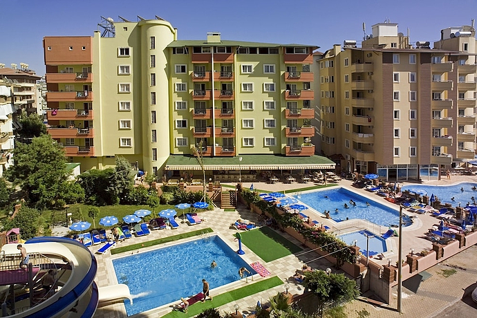 HOTEL: Este hotel construido en 1986, dispone de 5 plantas y 131 habitaciones. Tiene hall con recepción, caja de seguridad, cambio de divisa, ascensor y sala de televisión. SITUACIÓN: Está situado en el centro de la ciudad de Alanya. Los clientes se encontrarán frente a una playa. En las cercanías los clientes disponen de comercios, bares, restaurantes, discotecas y lugares de interés turístico. HABITACIÓN: Las habitaciones baño con secador de pelo, teléfono de línea directa, televisión satélite o por cable y radio. Además tienen minibar, suelo de baldosas, sistema de aire acondicionado y calefacción central. INSTALACIONES: En el exterior del hotel hay una piscina con bar, sombrillas y tumbonas. Puede realizar actividades como ping pong y billar. También ofrece un gimnasio y servicio de masajes. COMIDAS: En lo referente a lo gastronómico se dispone de desayuno y cena tipo buffet y almuerzo estilo a la carta. MÉTODOS DE PAGO: Se admite Visa y Mastercard.