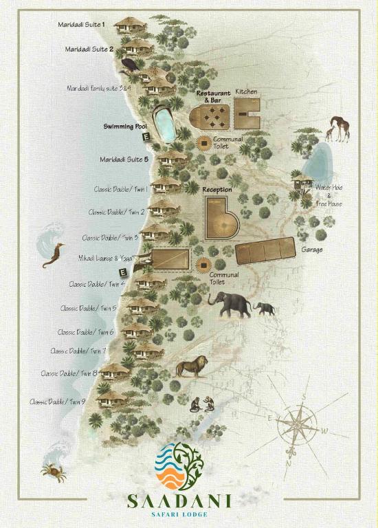 Saadani Safari Lodge este situată in Parcul Național Saadani din Tanzania și este vizitată de oaspeți pentru safari. In pret este inclus: mic dejun, pranz, cina si bauturi, dar DE ASEMENEA, taxa de concesiune a parcului (obligatoriu pentru vizitatori), un safari in bush pe zi si un safari pe rau pe zi conform programului de la cabana noastra.