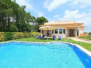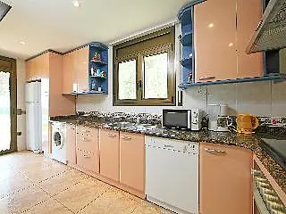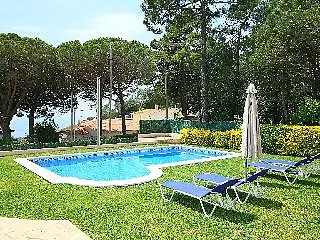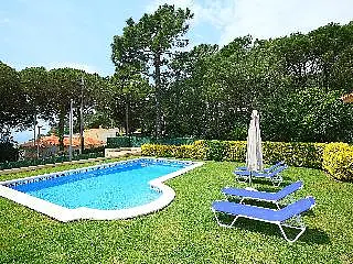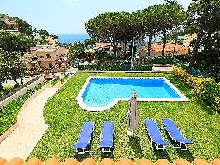 1 : Serra Brava 5 km from Lloret de Mar: Cosy, comfortable house "Salero", renovated in 2014. 3 km from the sea, 3 km from the beach. Private: large garden with lawn, swimming pool angular (9 x 5 m, 01.05.-18.10.). Patio, garden furniture, barbecue, planted inner courtyard single garage at the house. Supermarket 1 km, restaurant 1 km, bar 1 km, sandy beach "Cala Canyelles" 3 km. Golf course 9 km. Nearby attractions: Waterworld 7 km, Marineland 15 km. Please note: car recommended. Suitable for families, baby equipment on request. Groups of teenagers on request only. "Salero", 6-room house 130 m2. Spacious and bright, practical and cosy furnishings: living/dining room with satellite TV, hi-fi system and air conditioning. Exit to the patio, to the swimming pool. 1 room with 1 french bed (135 cm, length 190 cm). Exit to the swimming pool. 2 rooms, each room with 2 beds (90 cm, length 190 cm). Exit to the patio. 1 room with 1 sofabed. Exit to the patio. Kitchen (oven, dishwasher, 4 ceramic glass hob hotplates, microwave, freezer, electric coffee machine). Exit to the patio, to the swimming pool. Bath/WC, shower/bidet/WC. Upper floor: 1 room with bath/bidet/WC and bath/shower. Exit to the terrace. Large patio. Terrace furniture, barbecue (portable), deck chairs, covered balcony. View of the sea. Facilities: washing machine. Internet (WiFi). Suitable for families. 2 pets/ dogs allowed. HUGT-018558 Mandatory Fees paid on arrival: Breakage deposit by credit card Visa / Mastercard - 600.00 EUR fixed price