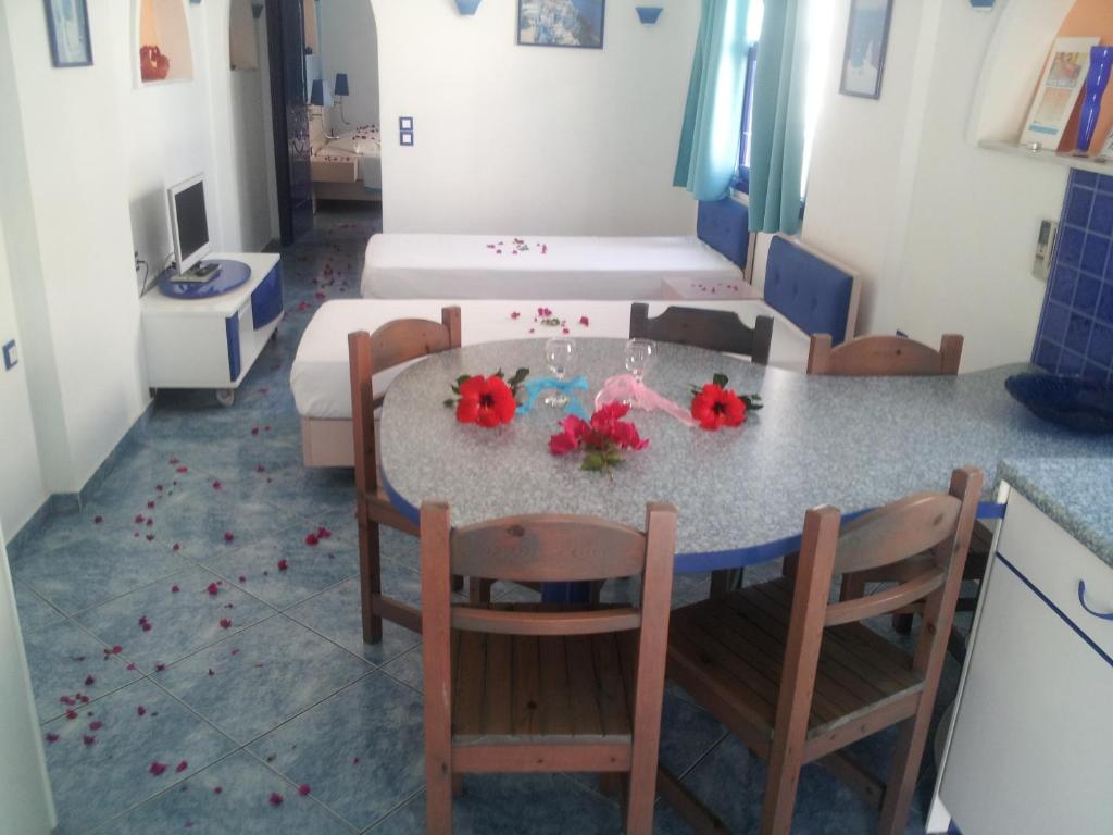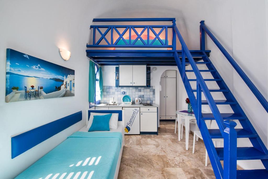 Renovate in 2012, studiourile și apartamentele Samson sunt decorate tradițional și au o chicinetă și un balcon cu vedere la Marea Egee sau la piscină. Aerul condiționat și TV prin satelit sunt standard.