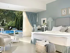 Camerele spatioase si modern decoarate au: TV satelit, DVD/CD player, acces gratuit la internet WIFI, aer conditionat, mini bar, seif, facilitati pentru prepararea ceaiului si a cafelei, aparat Nespresso, baie cu cada, uscator de par,halat si papuci de baie, terasa sau balcon. Camerele duble au 34 mp si capacitate maxima 3 persoane. Camerele duble Deluxe au 34 mp, capacitatea maxima 3 persoane si au in plus o gradina privata. Camerele Family au 68 mp, sunt formate din 2 camer duble interconectate, au capacitatea maxima de 3 adulti + 3 copii, iar la sosire se ofera din partea casei o sticla de vin si un cos cu fructe. Camerele Junior Suite cu gradina privata au 37 mp, capacitatea maxima 3 adulti si 1 copil sau 2 adulti si 2 copii, la sosire se ofera din partea casei o sticla de vin, apa si un cos de fructe, au cada cu hidromasaj si cabina de dus separata, gradina privata.