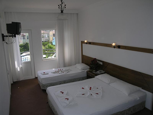 HOTEL: Este hotel reformado en 2001, cuenta con 58 habitaciones, 1 apartamento y 4 plantas. En la entrada puede encontrar un acogedor hall, recepción, caja de seguridad y cambio de divisa. Los clientes disponen de un kiosko, un pequeño supermercado, un bar y salón para ver la televisión. En cuanto a la gastronomía cuenta con 2 restaurantes a la carta, con sistema climatizado con área de no fumadores. Con cargo extra encontrará internet. Además tiene servicio de habitaciones, servicio de lavandería y atención médica. Para los niños cuenta con un patio de juegos para los mas pequeños. Tiene un parking. SITUACIÓN: Este hotel de estilo moderno, está a 2 kilómetros del centro histórico. Puede encontrar a 800 metros la playa. Se ofrece servicio de traslado. Los clientes pueden encontrar bares, restaurantes y una parada de transporte público. A 75 kilómetros está situado el centro de Antalya. A 65 km puede disponer del aeropuerto. HABITACIÓN: Las habitaciones disponen de cuarto de baño con ducha, secador de pelo, teléfono de línea directa, televisión satélite o por cable, equipo de música, moqueta, sistema de aire acondicionado central, una cama extra grande, caja fuerte con cargo extra y balcón o terraza. Cuenta con apartamentos de una habitación. INSTALACIONES: En la zona exterior dispone de piscina con una zona para los niños, un bar de piscina, tumbonas y sombrillas. Con cargo extra puede disfrutar de actividades acuáticas, vela y motos de agua. Se realizan actividades como remo, volley playa, billar y dardos. Se ofrece un programa de ocio y entretenimiento según la temporada. Se sitúa a 40 kilómetros de un campo de golf. MÉTODOS DE PAGO: Se admite Visa y Mastercard. OTRAS: Se ofrece a los huéspedes todas las comidas en buffet. Puede hacer su reserva en régimen de todo incluído.