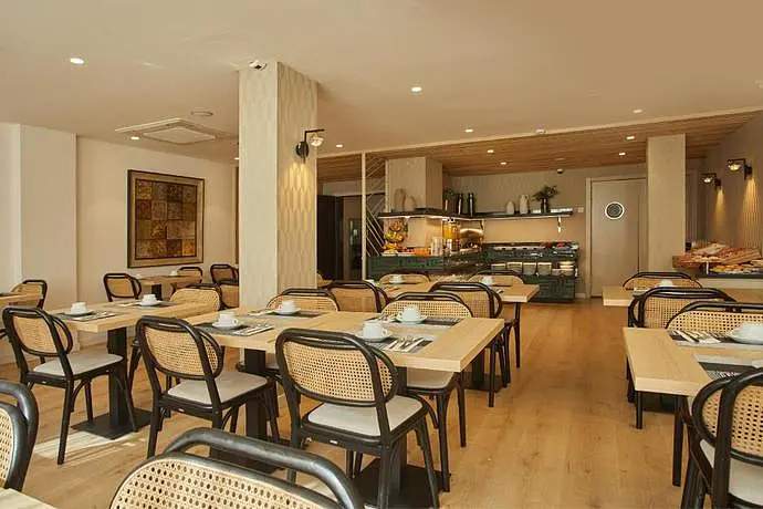 HOTEL: Este hotel cuenta con 40 habitaciones dobles y 4 plantas. Los clientes pueden disponer de un restaurante con sistema climatizado, una cafetería e internet. También ofrece a sus clientes servicio de lavandería, servicio de habitaciones, garaje y parking. SITUACIÓN: Este hotel, está en una zona céntrica. Puede encontrar a 200 metros el paseo marítimo. A 100 metros hay una parada de transporte público. A 1,5 kilómetros está situado una playa. HABITACIÓN: Las habitaciones tienen baño, secador de pelo, teléfono de línea directa, televisión, conexión a internet, un minibar, caja de seguridad con cargo extra y calefacción central. COMIDAS: En cuanto a la gastronomía el establecimiento cuenta con un desayuno tipo buffet. MÉTODOS DE PAGO: Se admite American Express y Visa.