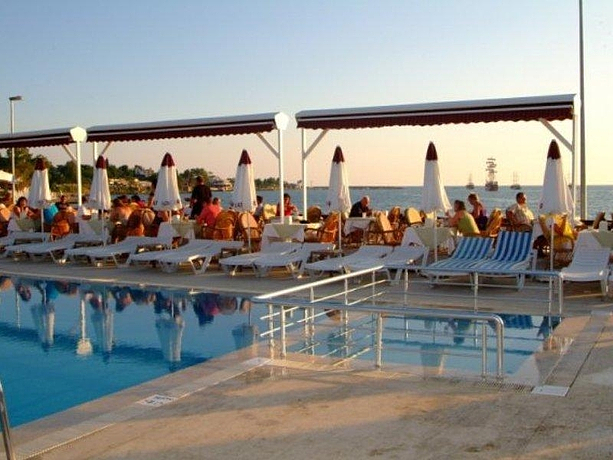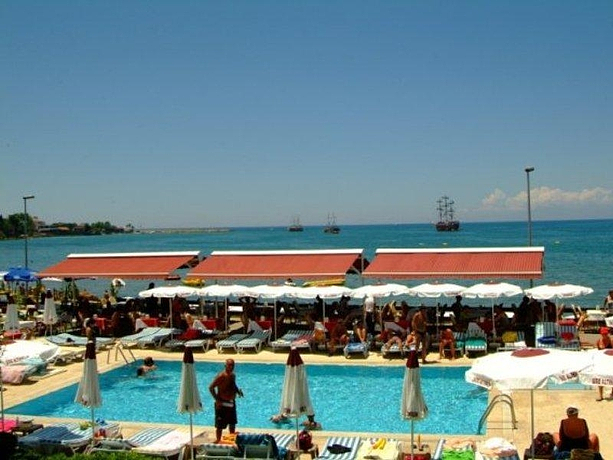 HOTEL: Este hotel ideal para el turismo de playa, cuenta con 99 bungalows con terraza. El establecimiento con climatización, cuenta con un vestíbulo con recepción, servicio de salida, caja de seguridad, servicio de cambio de moneda, un patio de juegos para los mas pequeños, servicio de lavandería de pago directo, cuenta con un restaurante, piscinas cubiertas y un bar. Los clientes disponen de una playa privada y wifi. SITUACIÓN: Este hotel, está junto al paseo marítimo. Se sitúa a 8 minutos del centro urbano. Frente al establecimiento hay una parada de transporte público. Está situado a 64 kilómetros del aeropuerto de Antalya. A 44 km de Belek Golf Club, HABITACIÓN: Está formado por bungalows con suelo de baldosas, cama doble, sistema de aire acondicionado, televisión vía satélite, cuarto de baño con ducha, secador de pelo, minibar, calefacción individual y terraza. INSTALACIONES: Los clientes tienen a su disposición una piscina, piscinas cubiertas y una zona de baño infantil. También tiene una terraza con tumbonas, sombrillas, playa privada con tumbonas y sombrillas sin pago adicional. Los clientes tienen disponible un baño turco, servicio de masajes y sauna mediante un abono extra. Se ofrece un programa de ocio y entretenimiento por las noches. En cuanto a lo gastronómico hay disponible todas las comidas se sirven en forma de buffet. Con cargo exra se ofrece almuerzo tipo a la carta.