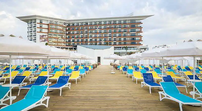 Enjoying a privileged position on Turkeys Mediterranean coast, this beachfront hotel has a modern and contemporary design and features a range of excellent facilities for guests comfort and convenience. Guests can choose to participate in the animation activities, relax on the hotels private beach or enjoy a therapeutic treatment in the wellness centre, while younger guests can benefit from the on-site kids club. Located some 20 km west of the popular resort of Alanya, there are links to public transport closeby enabling guests to explore the many nearby attractions with ease, such as Manavgat Waterfalls, Alanya Castle and the Roman and Hellenistic ruins dotted around modern-day Side.