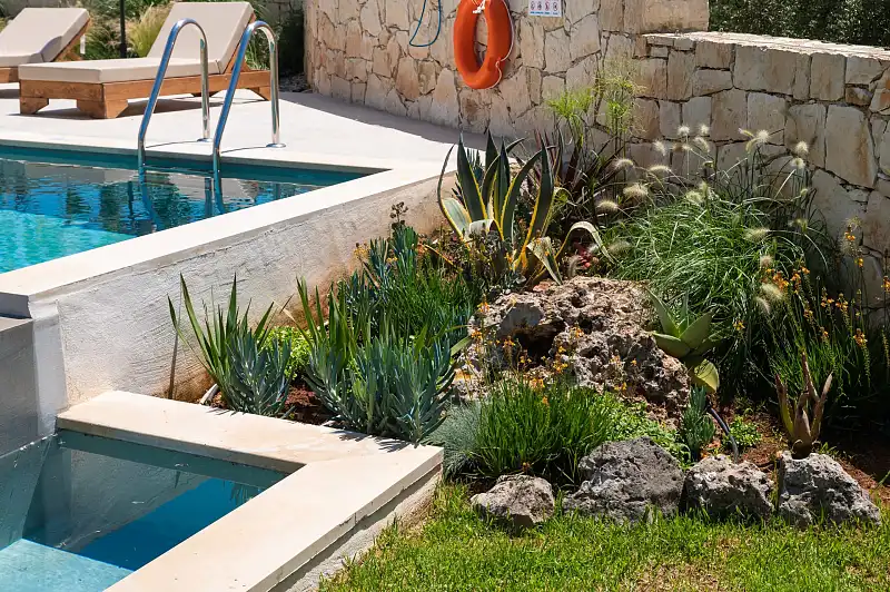 surrounded by lush greenery. Outside, a refreshing pool awaits, inviting you to leisurely dip in its