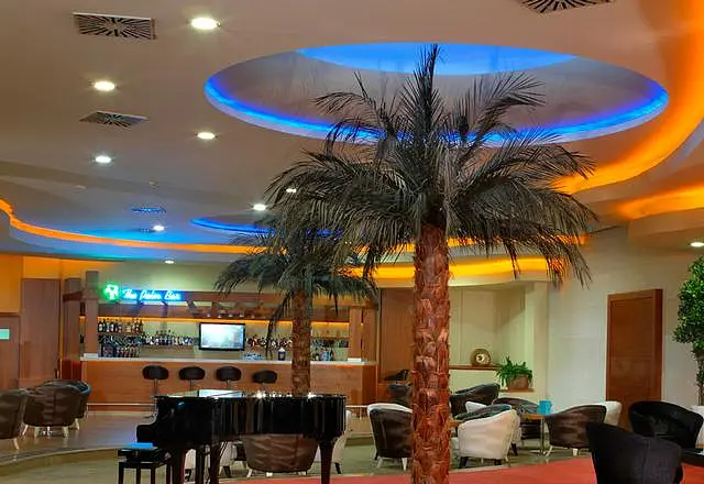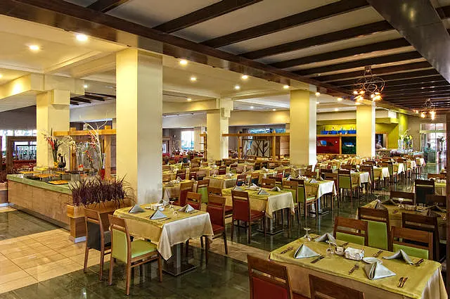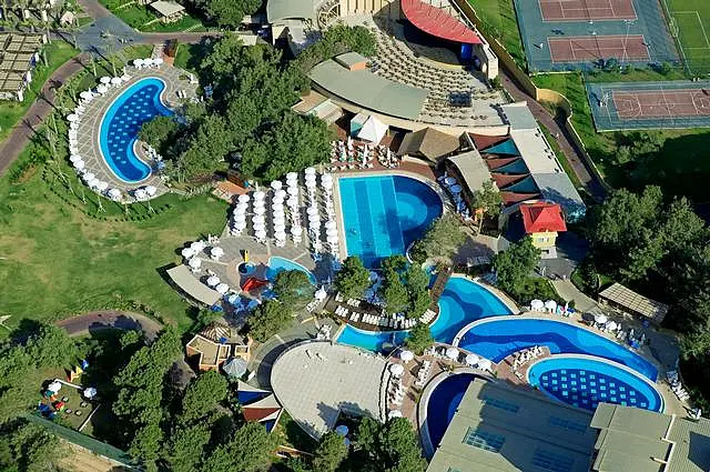 restaurant principal, 6 restaurante A la carte, 14 baruri, 6 piscine exterioare, 1 piscina interioara, aquaparc, cinema, cabinet medical, centru SPA, centru comercial, spalatorie, sala de fitness, mini-fotbal, terenuri de tenis, mini-golf, muzica live, discoteca, program de animatie, baie turceasca, jacuzzi, masaj, solar, kids-club, luna park. Hotelul are plaja proprie, de nisip si ponton. Umbrelutele, sezlongurile si saltelele sunt gratuite la plaja si la piscina hotelului.