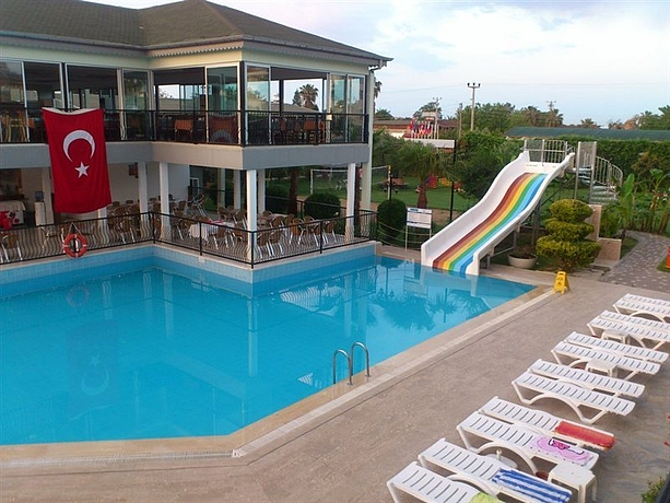 HOTEL: Este hotel fue inaugurado en 2004, cuenta con 124 habitaciones, 5 edificios y 2 plantas. Además los clientes tienen a su disposición una terraza, aire acondicionado, un vestíbulo con recepción, caja de seguridad y servicio de cambio de moneda. Hay disponible un jardín, una cafetería, una peluquería, un bar, pub, un restaurante con área de no fumadores y sillas para los niños. También ofrece servicio de lavandería y servicio médico. Para los niños cuenta con un miniclub y un parque. Los clientes disponen de un parking y un garaje. SITUACIÓN: Este hotel, está a 150 metros de la playa. Está situado a unos 700 metros del centro de la ciudad y el centro turístico donde podrá encontrar restaurantes, bares, discotecas, una parada de transporte público, tiendas y comercios. Situado a una distancia de 6 kms de Manavgat la estación de autobuses. Este hotel, está a 12 kilómetros de las cataratas de Manavgat. A 25 km podrá encontrar el teatro de Aspendos. Situado a una distancia de 50 kms de Alnaya, a 65 km podrá encontrar el aeropuerto de Antalya. HABITACIÓN: Las habitaciones cuentan con instalaciones para personas con movilidad reducida, televisión vía satélite y por cable, teléfono, minibar, cuarto de baño, secador de pelo, suelo de mármol, caja fuerte, cama doble o extra grande, moqueta, balcón, calefacción individual y aire acondicionado individual. INSTALACIONES: En la zona exterior puede encontrar una piscina con una zona para niños, toboganes, bar donde puede tomar un aperitivo, tumbonas y sombrillas. Los clientes tienen a su disposición un baño turco y una sauna. Se realizan actividades como aerobic, gimnasia acuática, gimnasia, servicio de masajes con cargo adicional, esquí acuático, motos de agua, lancha motora, bucear, windsurf, vela, catamarán, canoa, barca a pedales con cargo adicional, dardos, tenis, ping pong mediante un pago adicional, voleibol, badminton, billar con cargo adicional, montar a caballo, montar en bicicleta, bicicletas de montaña y remo. Según la temporada podrá disfrutar de una discoteca y programa de animación. Se ubica a 45 kilómetros de un campo de golf. COMIDAS: Se ofrece todas las comidas tipo buffet y almuerzo y cena servidos a la carta o como menú. Se puede encargar comida dietética, dispone de platos especiales. Se puede reservar en media pensión y pensión completa o todo incluído. MÉTODOS DE PAGO: Se admite American Express, Visa y Mastercard.