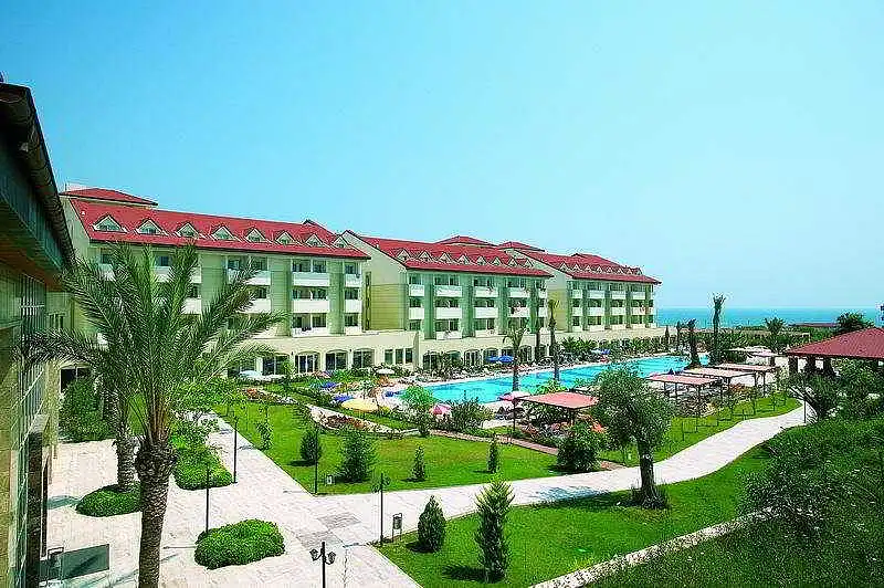 This high- class resort complex is only 9 km from Side and 60 km from Antalya. The nearest airport is 55 km away. Links of the public transport network are conveniently reached from the hotel and provide easy transportation to Side and Manavgat every 20 minutes. This accommodation establishment is set in palm gardens and has its own private beach. Guests are welcomed to take advantage of the many facilities and amenities on offer. The friendly and well trained staff is also there to contribute to a memorable and pleasant stay. All in room amenities are selected, so that guests lack nothing during their stay, and in addition to an en suite bathroom, each room comes with a private balcony.