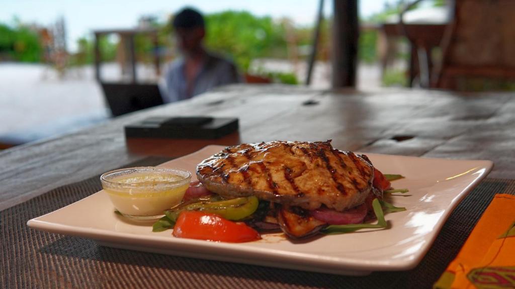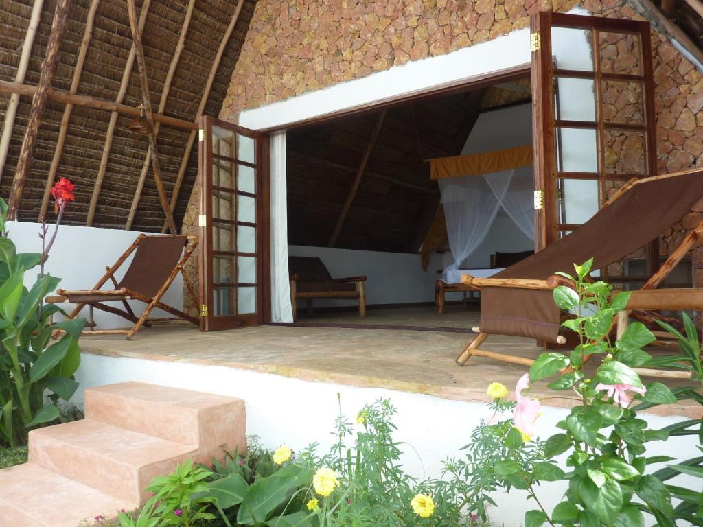 Bungalourile au intrare privată și terasă cu vedere la Oceanul Indian. Unitățile cu acoperiș din paie oferă ventilator, canapea, birou și plasă de țanțari drapată deasupra patului. Baia inchisă are cărămidă expusă, precum si cadă sau duș.