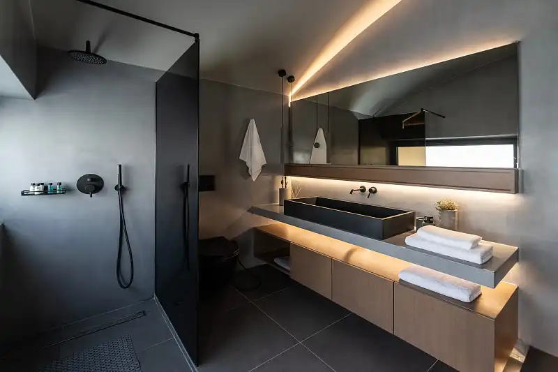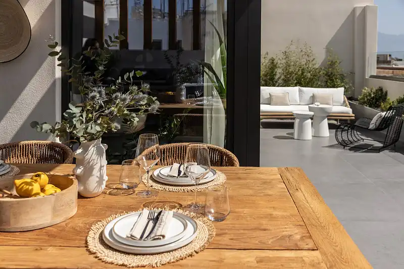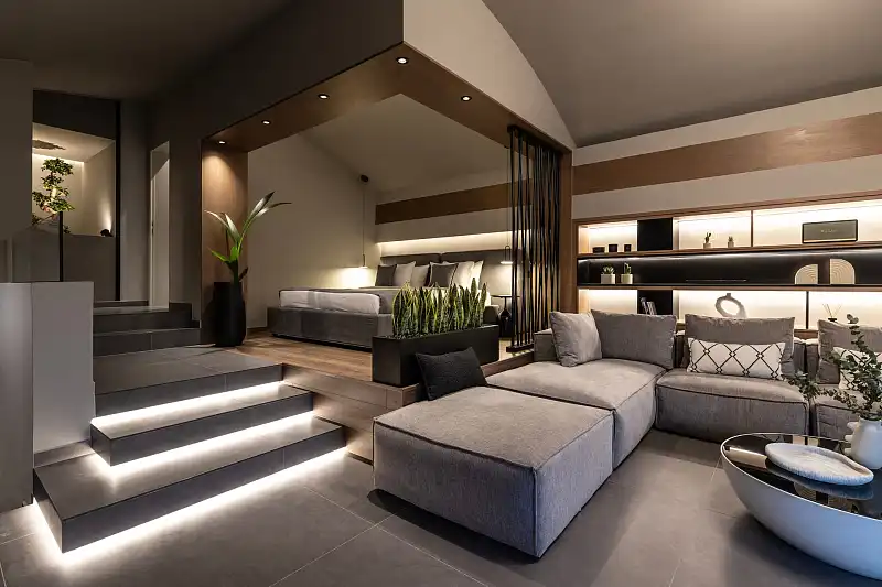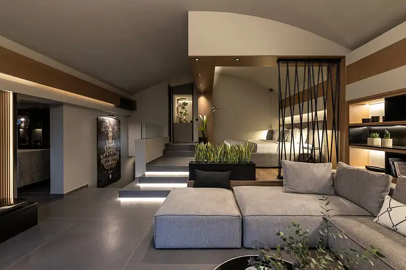 Give yourself a moment of relaxation, forget your routine and simply let go within its premises. Natural materials like stone and wood, eclectic pieces of furniture and art, a palette of muted greys and beiges, and an opulent feel throughout, all combine to make your suite a uniquely compelling place to be. It features a open-plan bedroom with a queen bed, a luxurious bathroom, a fully equipped kitchen and a living rooms area, a fully furnished terrace and an outdoor Hot Tub overlooking the city.