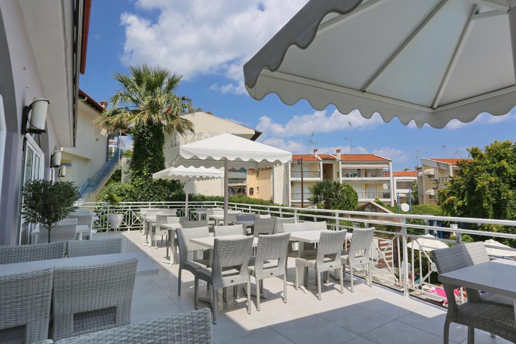 Restaurantul hotelului servește mic dejun in stil bufet, cu o selecție de preparate internaționale și grecești. In imediata apropiere se găsesc numeroase taverne tradiționale grecești și restaurante cu specific mediteranean.