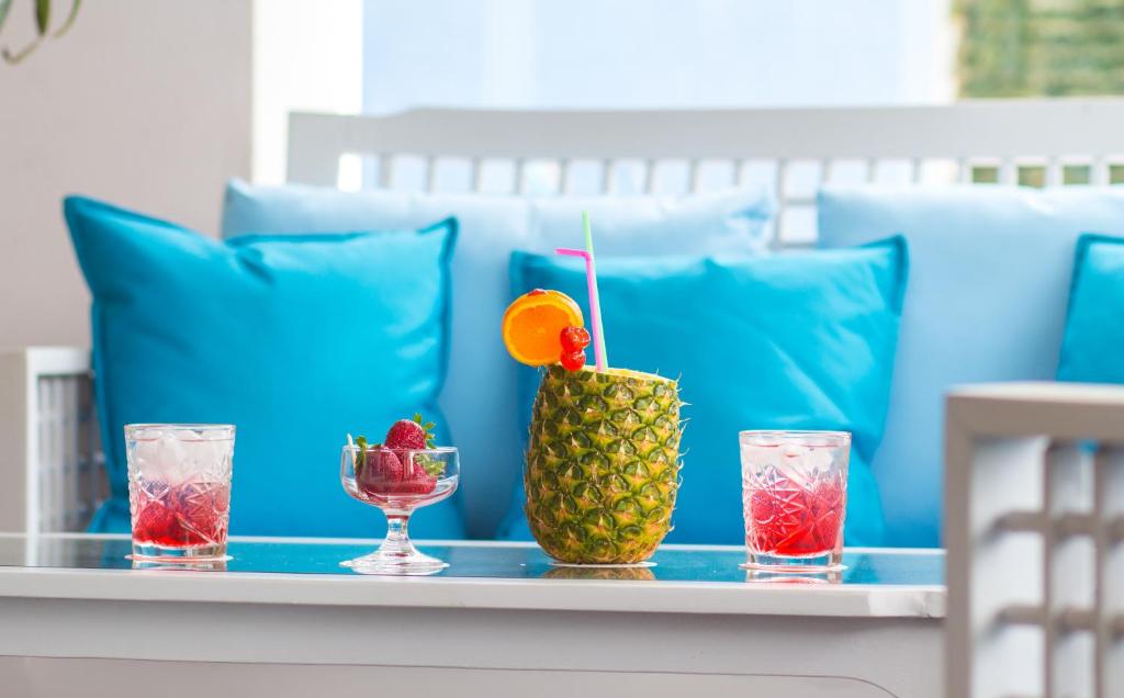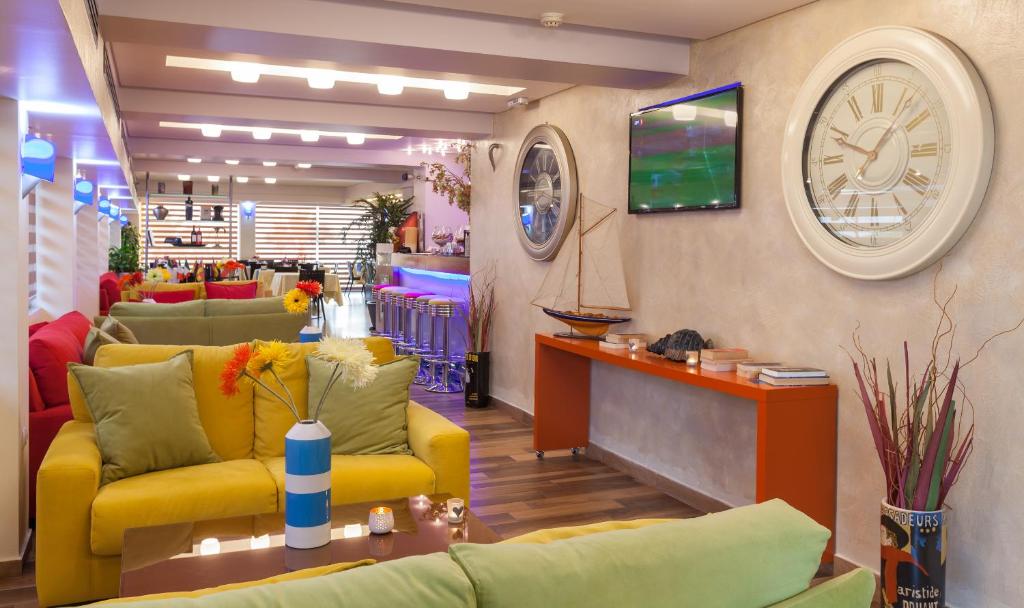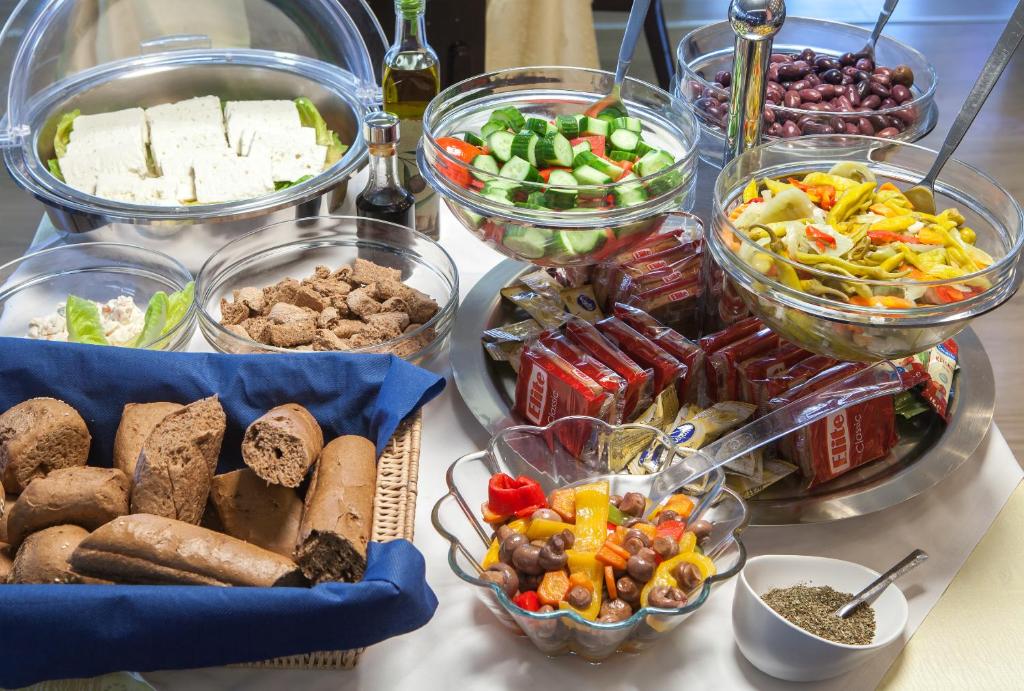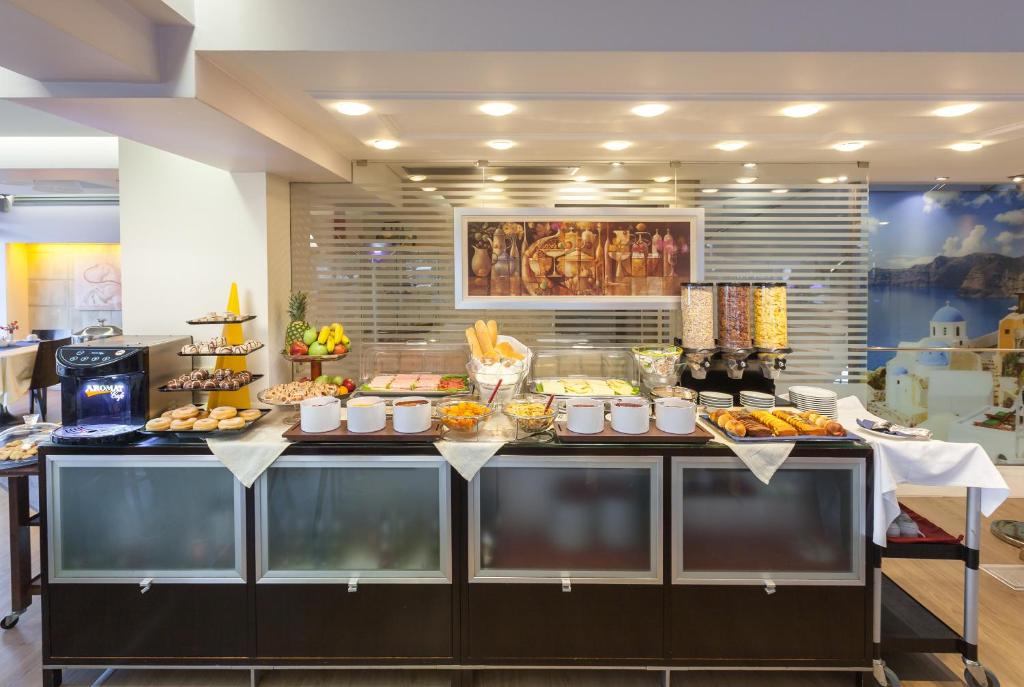 La etajul 1 al hotelului există un restaurant cu bar, care servește preparate culinare și băuturi, cu vedere la mare. De asemenea, la etajul 1 există o terasă cu o zonă sezonieră, disponibilă din luna mai pană in octombrie. Oaspeții pot incerca o selecție de produse grecești și la micul dejun.