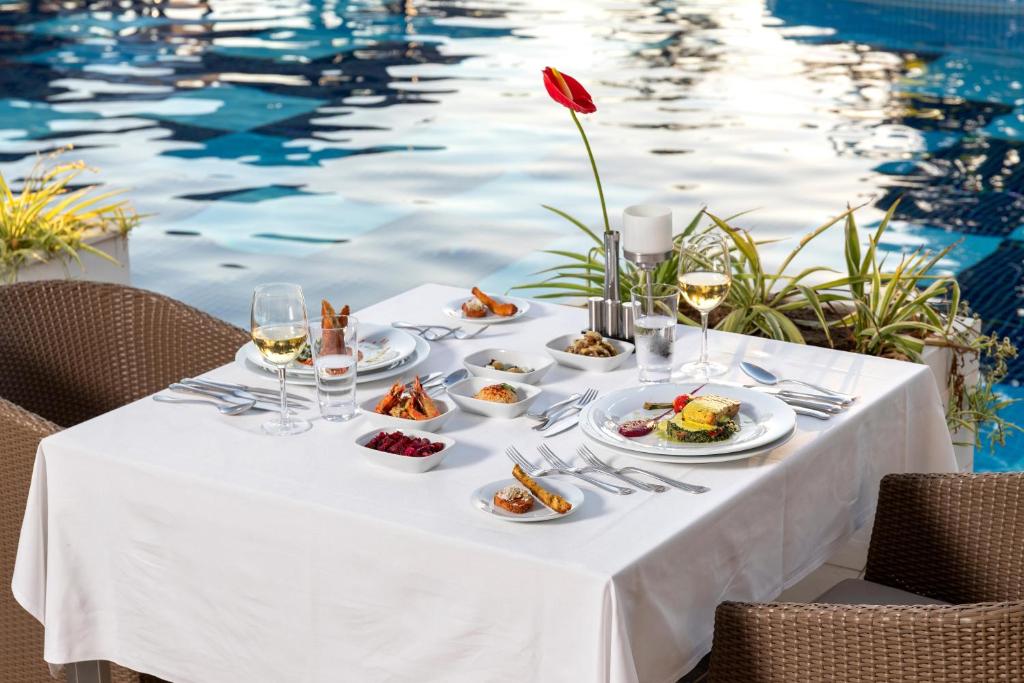 Micul dejun zilnic este servit in stil bufet. De asemenea, vă puteți bucura de preparate din bucătăria internațională și locală la restaurantele hotelului. Barurile servesc diverse cocktailuri și băuturi.
