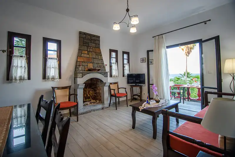 The two bedroom villas and first floor apartments cover approx.70sqm and can offer accommodation up to five guests-comprise of two bedrooms with comfortable beds and en suite bathroom plus a living room with sofa bed and a fully equipped kitchen. The views from the private balcony are superb. All two bedroom villas are suitable for relaxing family vacations.(first floor apartments last renovated 2025)