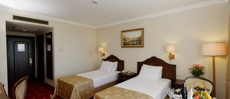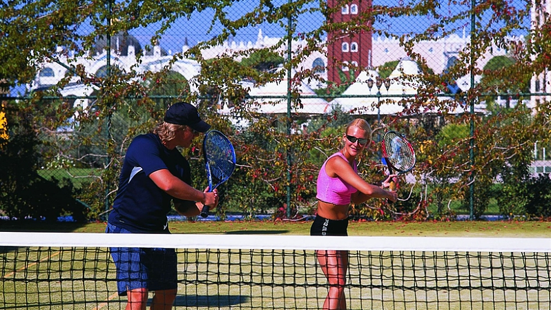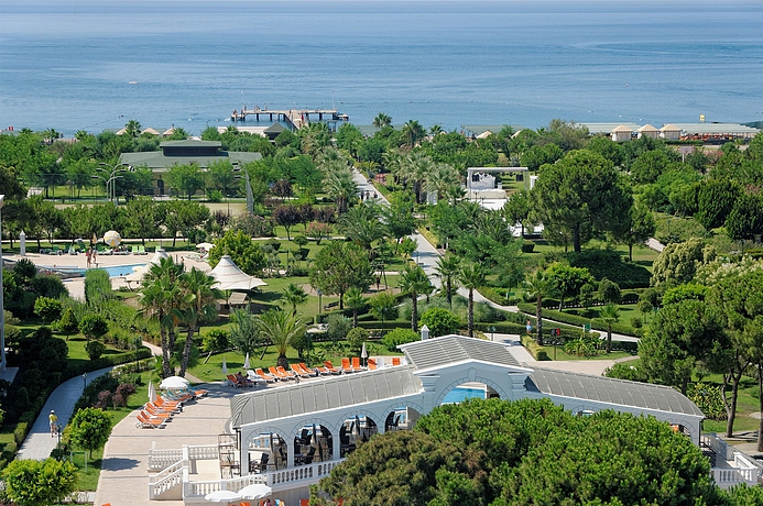 SITUACIÓN: Este lujoso hotel, está en un entorno privilegiado, a 200 metros de la playa. A 10 km puede disfrutar de tiendas, áreas de ocio y zonas de entretenimiento y ocio. A 25 kilómetros está situado el aeropuerto de Antalya. HOTEL: El hotel edificado en 2003, dispone de 4 plantas, 539 habitaciones, 15 suites, 6 habitaciones adaptadas a personas con movilidad reducida y 3 villas. Lujoso, en la entrada puede encontrar un vestíbulo, una recepción, caja de seguridad, un ascensor y servicio de cambio de moneda. También cuenta con una sala de juegos, un salón de televisión, alquiler de bicicletas, un bar acogedor, discoteca, auditorio y un restaurante con sillas para los niños. Se ofrece servicio de lavandería, atención médica y servicio de habitaciones. Este establecimiento es ideal para personas que viajen por motivos de negocios. Los clientes pueden disponer de una sala de conferencias con internet. En el exterior puede encontrar un patio de juegos para los mas pequeños, club infantil, garaje y parking. HABITACIÓN: Todos los alojamientos tienen cuarto de baño, teléfono, televisión satélite o por cable, radio, internet, caja de seguridad con cargo extra, minibar, aire acondicionado, calefacción central y moqueta.