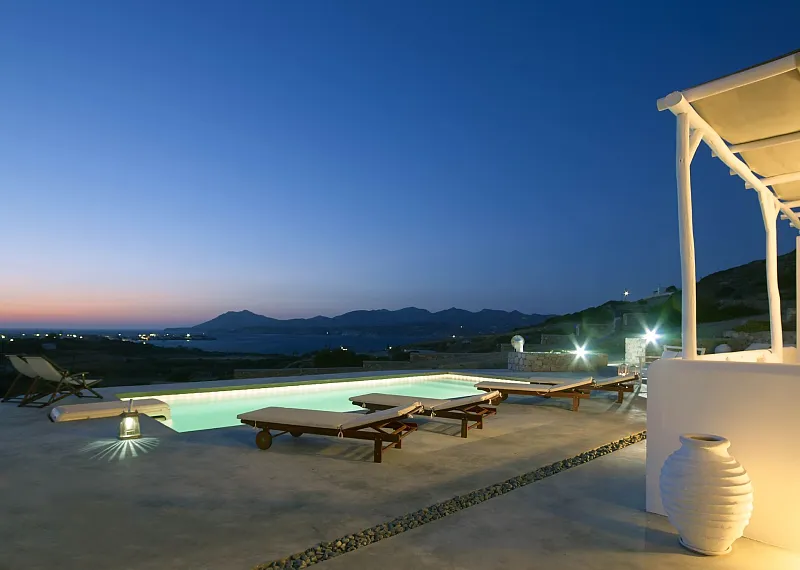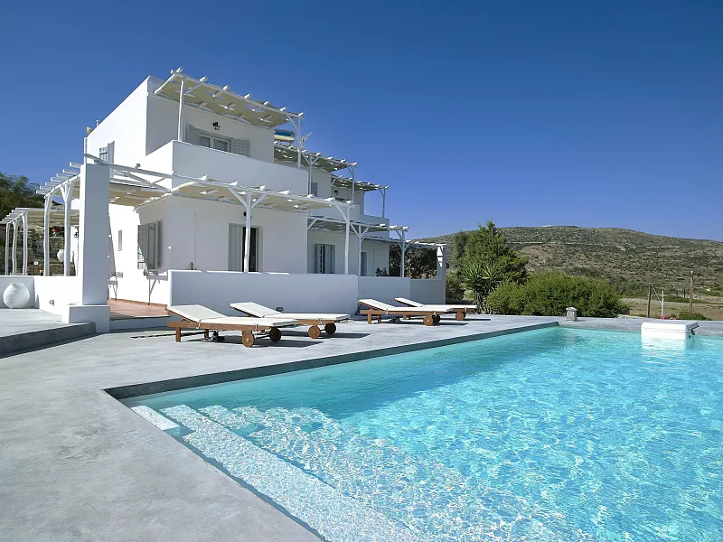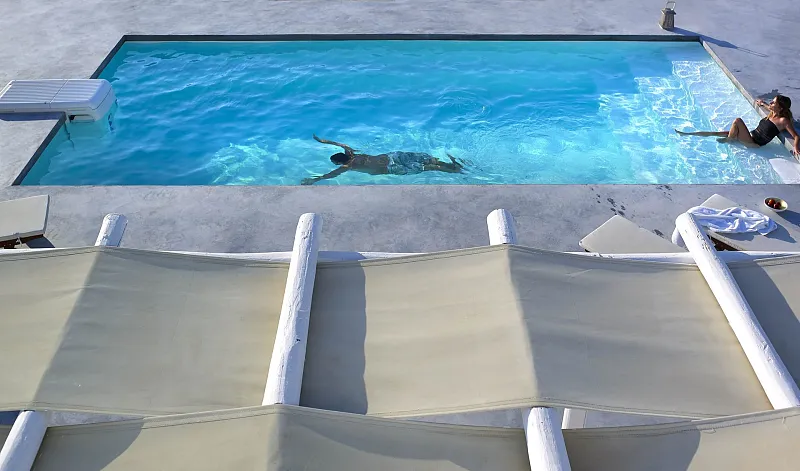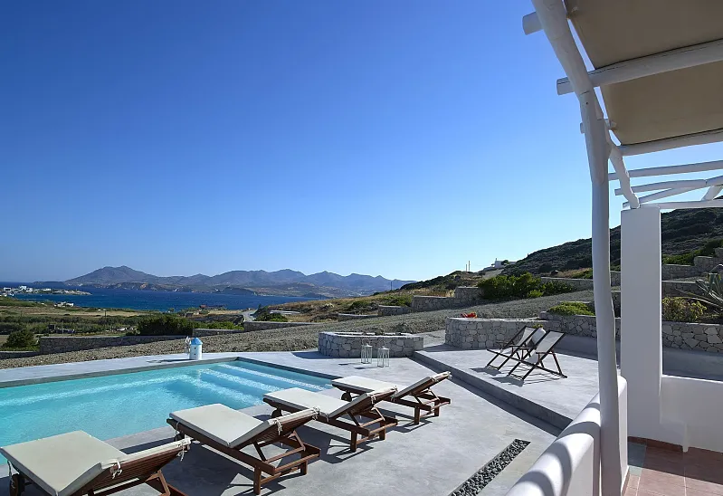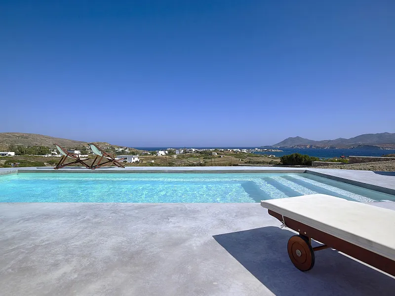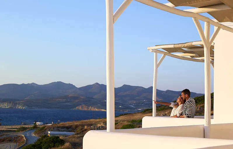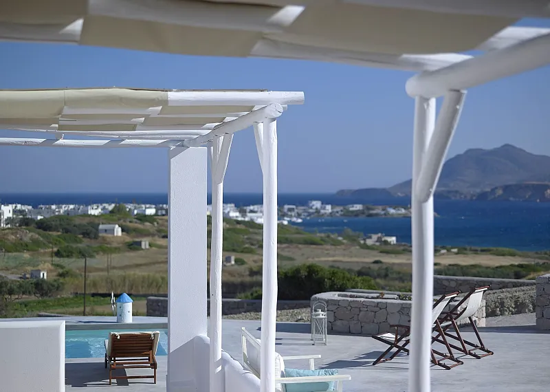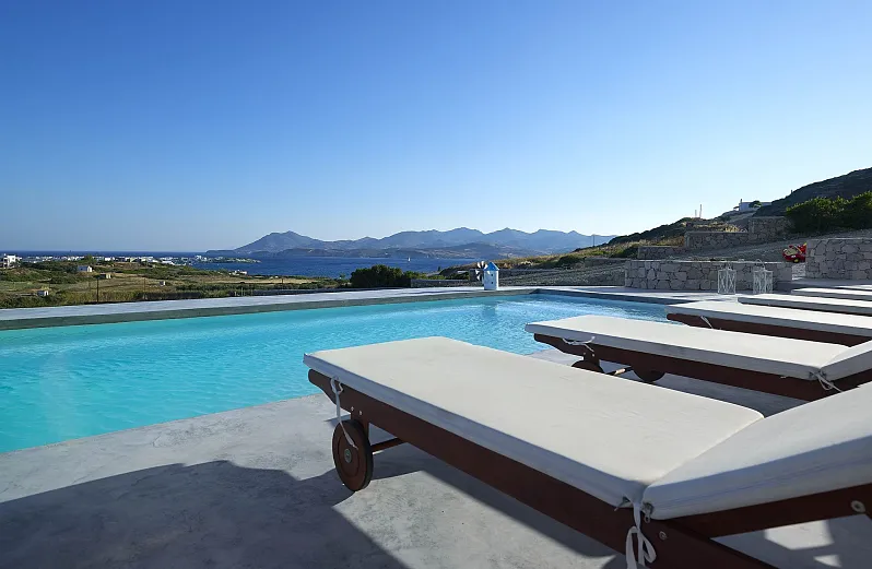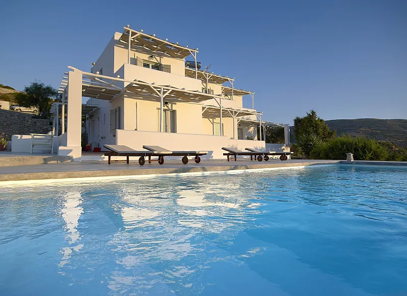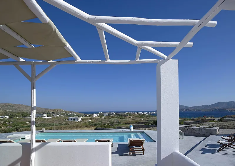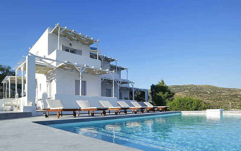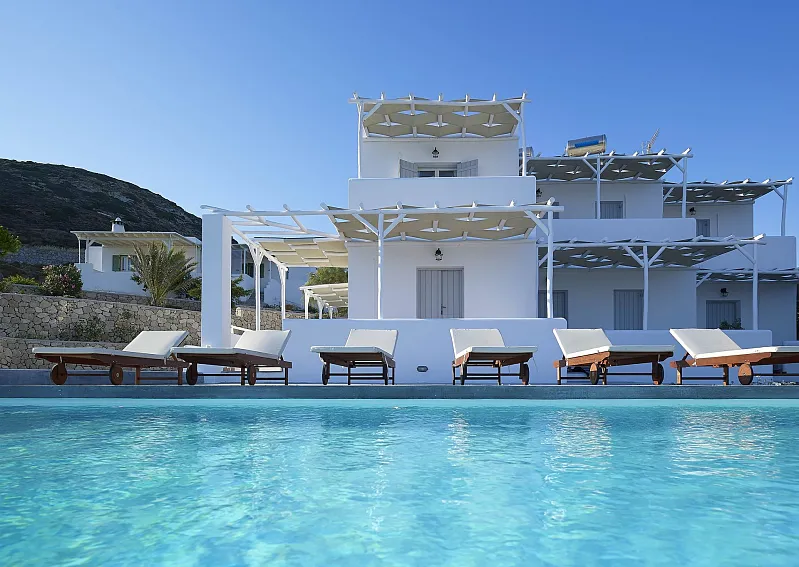 At Milos, the beautiful Cycladic island, a lovely summer's surprise awaits for you in the picturesque and seaside Pollonia, “Villa Gallis" hotel. Built in 2008 and renovated just a few months ago, it will offer you an unforgettable stay in its fresh, modern and luxurious rooms. The white of the unprecedented Cycladic architecture is combined with the modern gray, the cold stone and the blue sky, creating a beautiful high aesthetic image. The panoramic view at aegean blue from all the rooms will offer you the relaxation you seek for and the pool will entice you into cool dives. As the “Villa Gallis” is a really special hotel in Milos, do not forget to walk in the garden and taste the fruits of the trees, such as frigs, prickly pears and other summer fruits. It will definitely rejuvenate you! Milos is famous for its indented coastline and its wonderful beaches, so start your excursions from our hotel and discover why so many visitors keep coming back to Milos.
