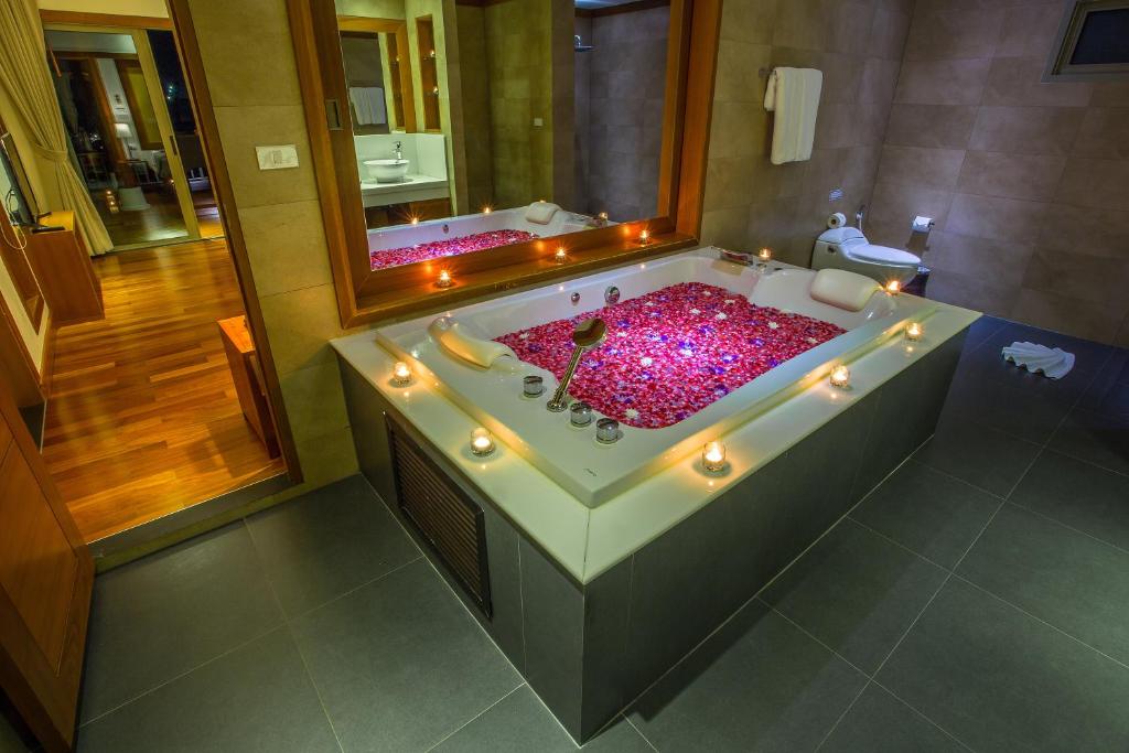 Bucătăria modernă este complet utilată cu cuptor și cuptor cu microunde. Băile semi-exterioare au cadă și ferestre din sticlă cu vedere la Marea Andaman.