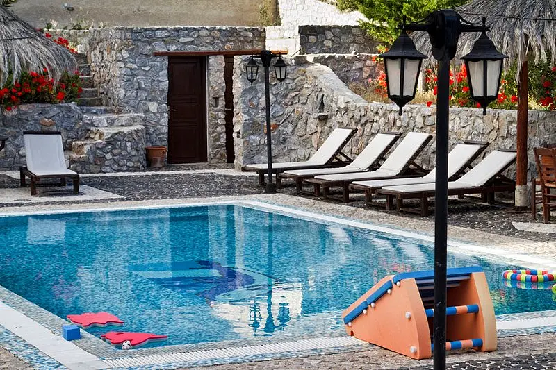 Deep in the heart of Santorini countryside, one can find The Birds Villa Apartments . The Birds Villa Apartments lies in Perissa beach on the road to Ancient Thira at the base of the Mesa Vouno mountain, under the protection of Katefiani monastery just 500 meters from the black volcanic beach of Perissa. The large fresh water swimming pools are surrounded by high walls for absolute privacy. Surrounding the Villa flowers & olive trees create a relaxing environment.All the rooms and apartments are self catering with full kitchen facilities and separate bedrooms.The Birds is not a hotel or private rooms, is a private villa with 8 nice and comfortable apartments.All apartments have one-two separate bedroom and can accommodate from 2 up to 6 people. There is a swimming poll with an opposite swimming system and extra powerful hydro and aero massage, umbrellas and sun beds, Very nice and big private balconies.Fully equipped kitchen, safe deposit, Satelite TV, DVD player iron facilities, hair dryer A/C, large bathroom with 24 hours hot water. Continental Breakfast. After your request we can arrange a transfer from the port or the airport to your apartment. Also there is an outdoor barbeque area that you can use.We offer free car rental all year round ( except from 25 July till 25 of August )Our Villa with the 3 bedrooms includes car all year round also.