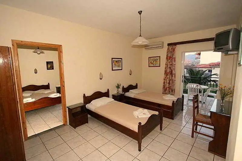 This apartment complex is situated on the beautiful island of Zakynthos, Zante, just a few minutes from the centre of the famous Lagana resort, home of the caretta-caretta sea turtle. It is the perfect choice for those seeking a quiet place to enjoy a relaxing holiday in a family-run property, and at the same time it is just a few minutes away from the resort centre, famous for its lively nightlife. This establishment has a small supermarket which is convenient for guests who might have forgotten to pack any essentials. The spacious rooms that await guests are fully furnished with modern amenities to provide added comfort. Guests can choose to take a cooling dip in the outdoor swimming pool, complete with complimentary sun loungers and parasols. Guests can also make use of a pool table, table football and a lounge area with satellite TV, showing movies and all major sporting events.