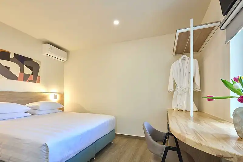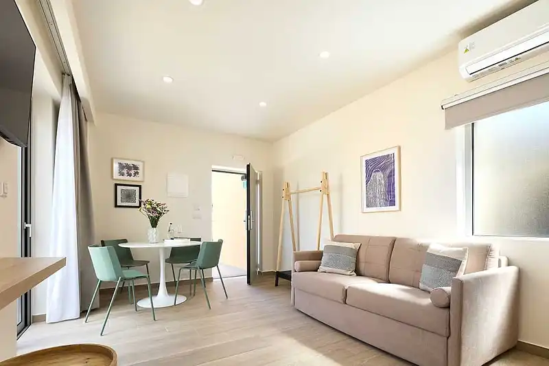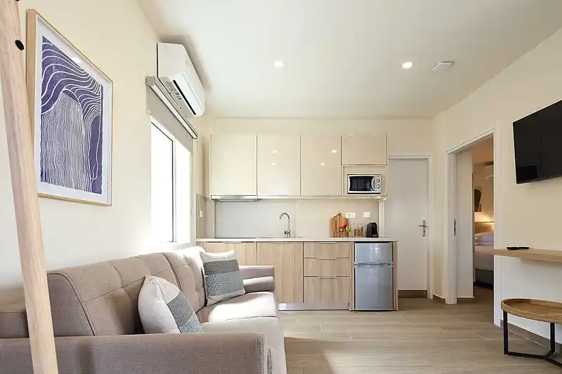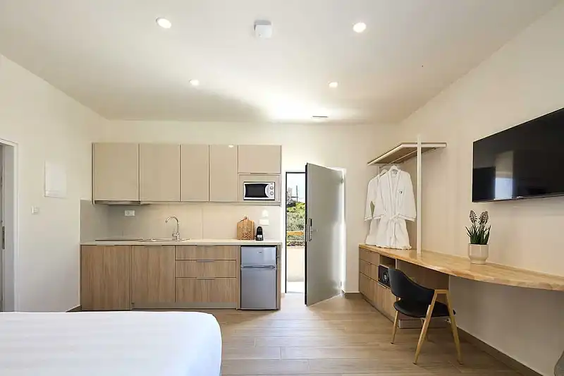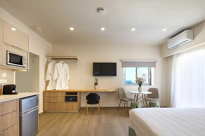 The apartments and studios are fully furnished, with comfortable spaces and facilities for enjoyable sleep, fully equipped kitchens, and spacious balconies. Focusing on the individual needs of each guest, they all have free Wi-Fi, air conditioning, a satellite smart TV, a safety deposit box, a work surface, a Nespresso coffee maker, a refrigerator, a kettle, as well as a private bathroom, with free toiletries and a hairdryer.