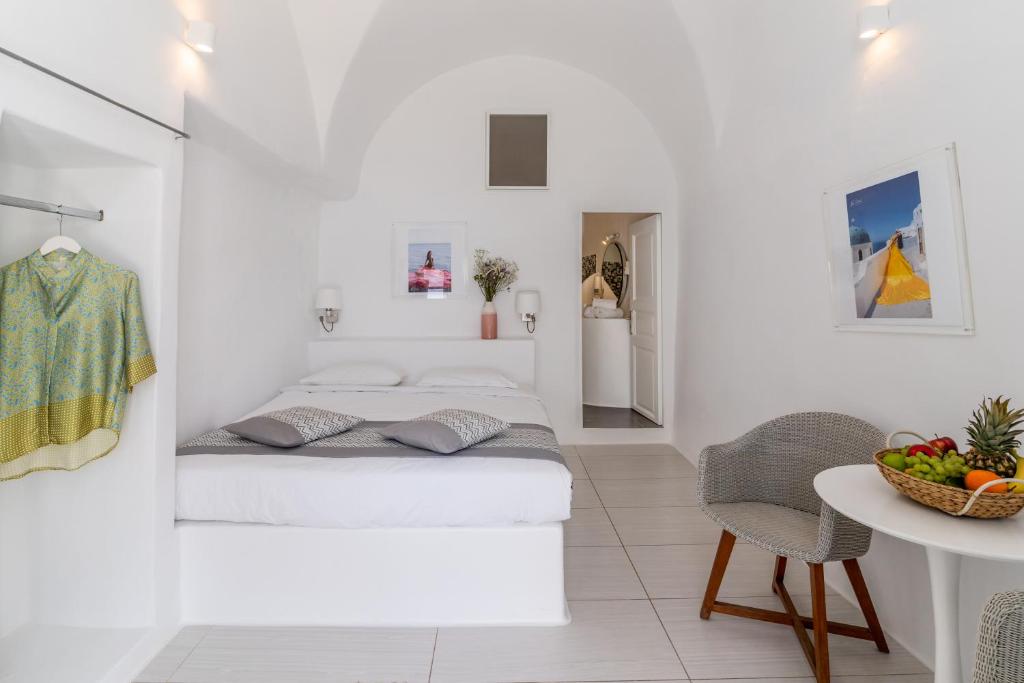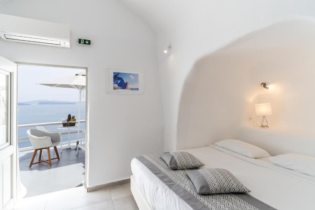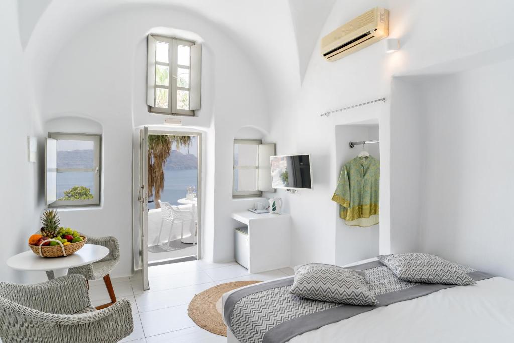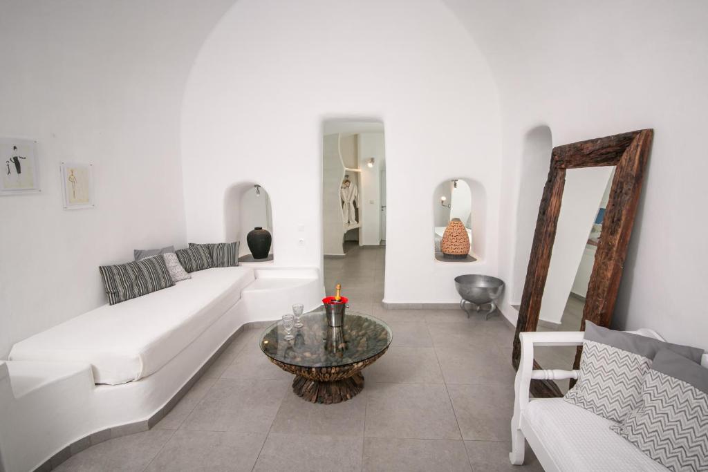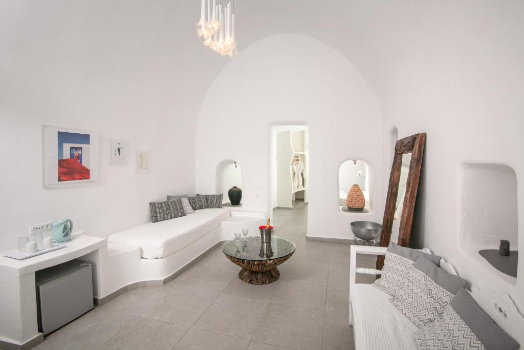 Suitele spațioase, decorate in stilul cicladic tradițional, imbină perfect albul imaculat cu accente moderne și elegante. Fiecare suită dispune de terasă privată cu vedere la Caldera, iar unele beneficiază de propriile piscine infinity sau jacuzzi in aer liber.