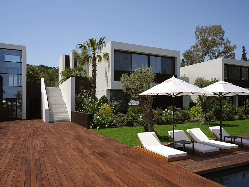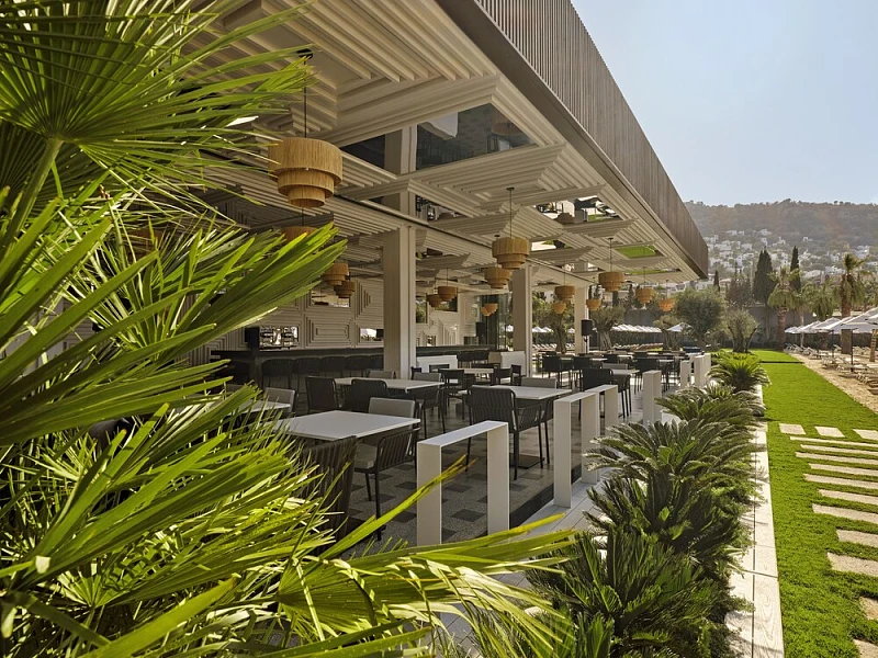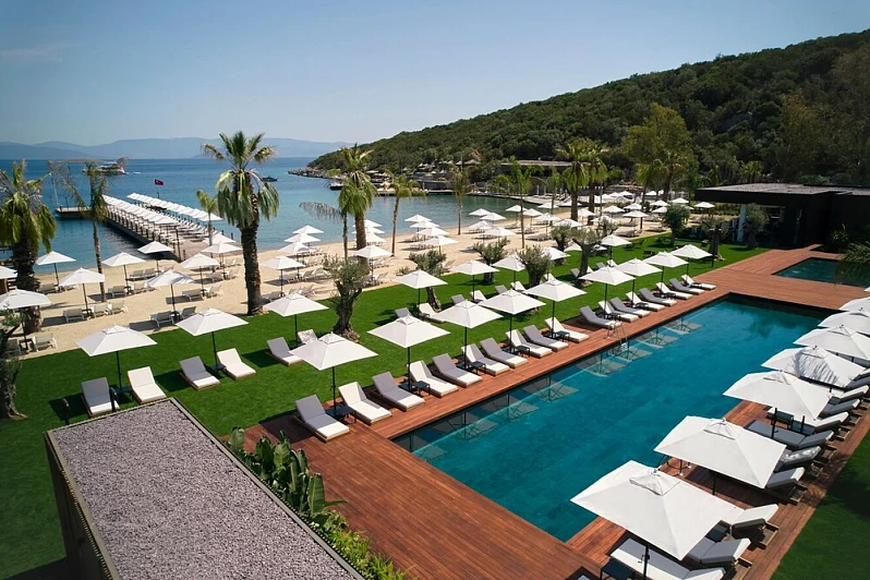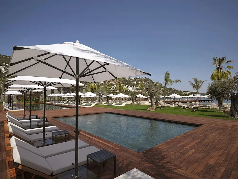Services and facilities include: Reception, restaurants, pastry, bars, outdoor pool with children's pool and slides, private beach area with sun loungers, fitness centre, tennis court, mini golf, table tennis, mini football, wellness with turkish bath, sauna and massages (with extra charge), mini club (04-12 years) with playground and Wi-Fi Internet access available at the lobby. The rooms are equipped with: Bathroom, telephone, TV, A/C, safe and balcony or terrace (some rooms with french balcony). ** In case of choosing the option of "all inclusive": The All Inclusive-concept includes all meals (breakfast, lunch, dinner and snacks) and mealtime drinks such as soft drinks, beer, wine, water and alcoholic drinks, all of local brands. Drinks are served from morning until late evening (approx until 22.-24.00 hrs). Opening times vary between different hotels. In certain hotels the activities program is also included. ** Address: Hebil Mevkii Golturkbuku, 48400 Bodrum, Mugla, Turkey