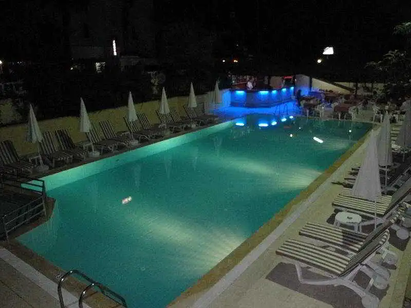 The hotel is located in the centre of Kemer, opposite a police station. The beach is approximately 350 m and restaurants and bars can be found in around 50 m away. Antalya Airport is 65 kms from the property. This air-conditioned establishment comprises 47 rooms. It offers guests a bar/restaurant with hookah (water pipes) beside the pool, a caf¿nd a 24-hour reception service. Other facilities include currency exchange, childrens playground and wireless Internet access. The rooms are equipped with an en-suite bathroom, individually regulated air conditioning and heating mini fridge and satellite TV. The hotel has a sauna and Turkish bath with massages available .There is an outdoor swimming pool with childrens swimming area, sun lounger and parasols.