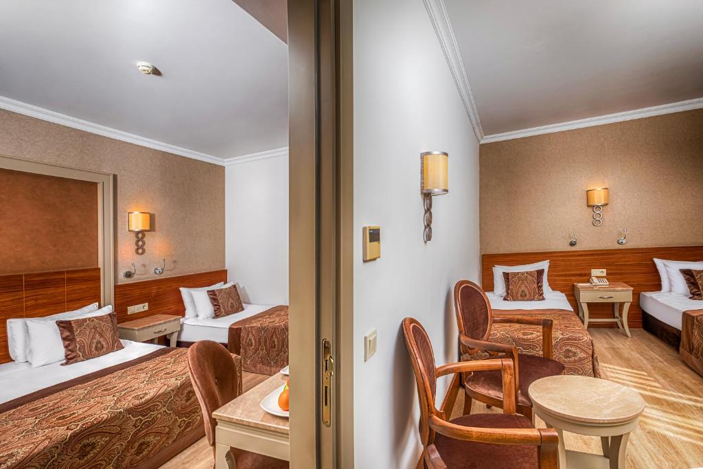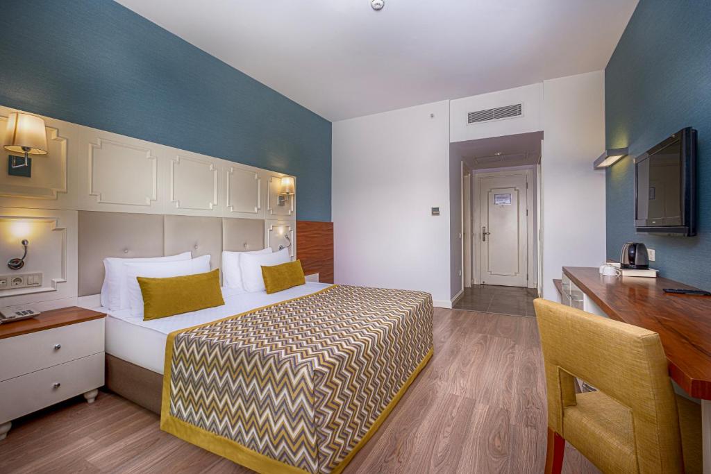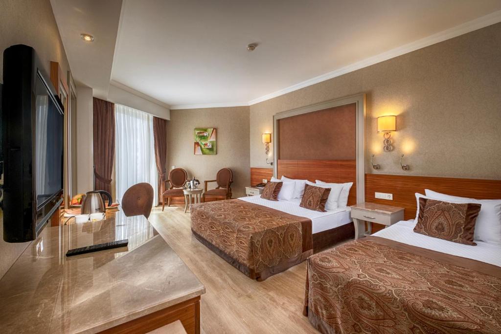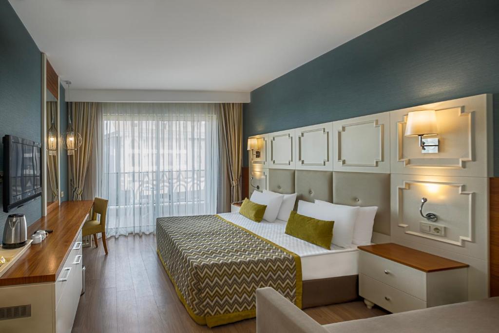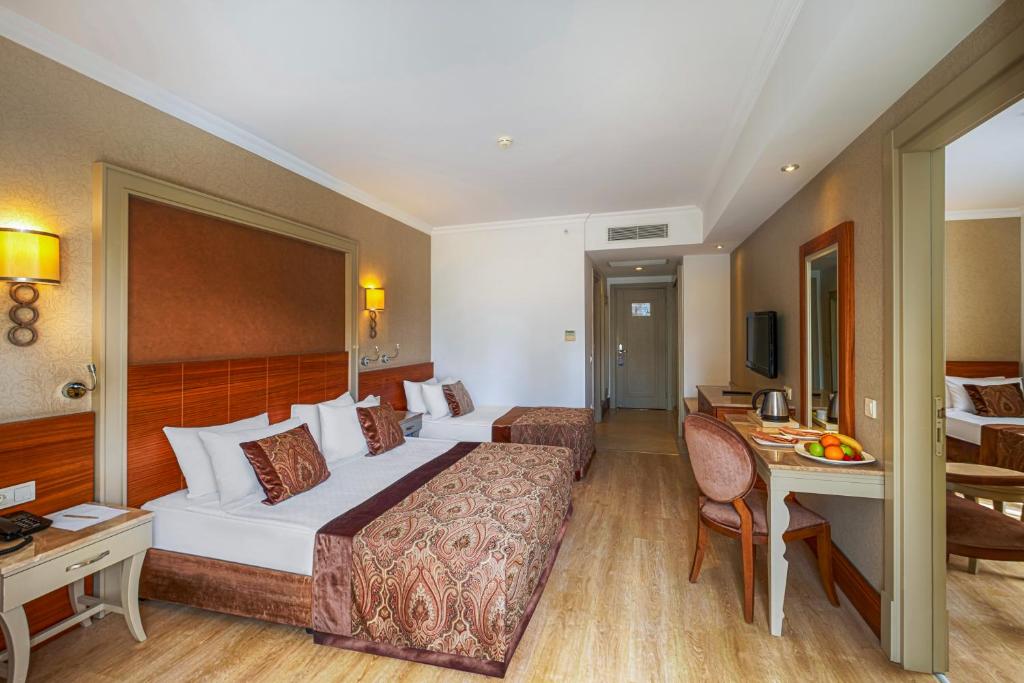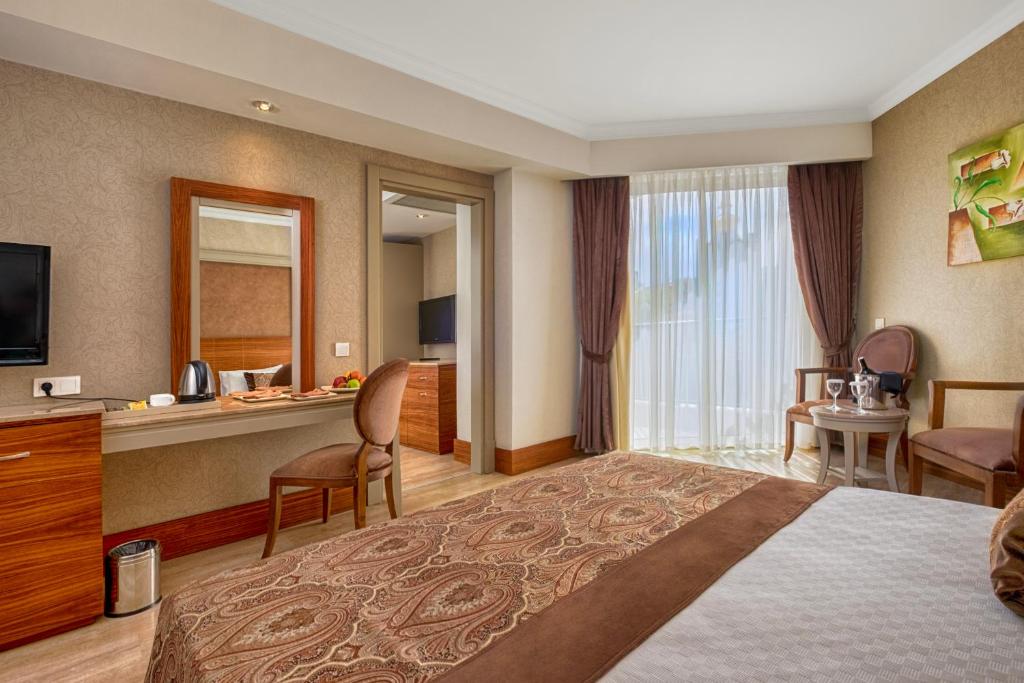 Camerele sunt decorate in nuanțe calde și sunt dotate cu aer condiționat, TV prin satelit, minibar și balcon. Pentru momentele de relaxare, hotelul pune la dispoziție un centru spa cu saună și baie turcească tradițională, precum și o zonă de fitness pentru cei care doresc să rămană activi in vacanță.