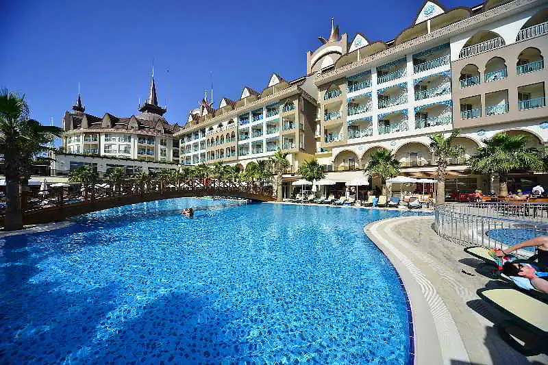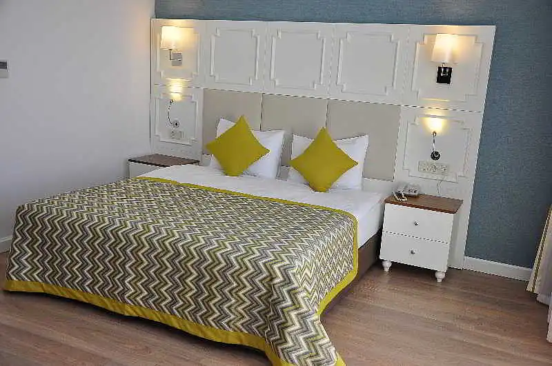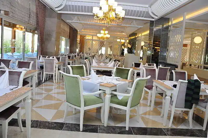 This fabulous resort boasts an enviable location in picturesque Evrenseki within a 10-minute drive away from the ancient city of Side and only 300 metres from a pristine white sandy beach surrounded by swaying palm-trees. This hotel boasts a luxurious design, top notch facilities and attentive service. The spacious and luminous guestrooms offer a magnificent design blending classical elegance with traditional elements. There are 4 disability-friendly rooms on the premises. Guests will pamper their palates in the alluring ambiance of the on-site restaurant and enjoy a drink from the hotel bar. Afterwards they may have a cooling dip in the dazzling pool or soak up the sun at the poolside terrace while the children play at the paddling pool. Those who wish to keep in fit may tone up at the gym while those who want to unwind may indulge in relaxing treatments of the on-site spa.