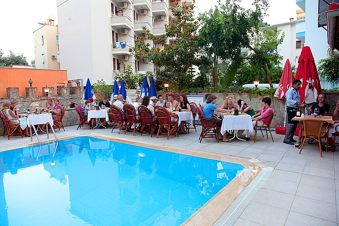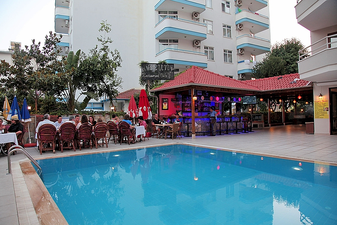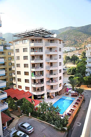 HOTEL: Este complejo de apartamentos con sistema climatizado, cuenta con 7 plantas y 33 apartamentos, 27 habitaciones triples y 6 habitaciones individuales. Los clientes pueden disponer de un vestíbulo, ascensores, una recepción, caja de seguridad, guardarropas y servicio de cambio de moneda. Los clientes pueden encontrar un pequeño supermercado, una cafetería, kiosko, una peluquería, bar, discoteca, pub, un salón de televisión, un restaurante con climatización con terraza y sillas para los niños. Se ofrece a los huéspedes internet, servicio de habitaciones, servicio de lavandería, servicio médico, mini club, parque, alquiler de bicicletas, sótano de bicicletas, garaje y parking. SITUACIÓN: Está situado en la playa de Cleopatra. A 1 km del establecimiento los clientes pueden encontrar el centro de la ciudad de Alanya. A 90 minutos los clientes del establecimiento pueden disponer del aeropuerto. HABITACIÓN: Está formado por apartamentos de una habitación, con completo equipamiento, baño con secador de pelo, una ducha, salón-dormitorio y teléfono de línea directa. También cuentan con televisión satélite o por cable, radio, conexión a internet, una cocina pequeña, minibar, caja de seguridad con cargo extra, calefacción central, cama doble o king size, aire acondicionado con cargo extra, calefacción y balcón o terraza. INSTALACIONES: En la parte exterior del hotel encontrará una piscina con una parte para los niños, bar donde puede tomar un aperitivo, tumbonas y sombrillas con cargo adicional. Puede encontrar una piscina cubierta, tratamientos de cuidado corporal y el servicio de masajes. Puede jugar al volley playa y practicar actividades acuáticas con cargo adicional. También ofrece a sus clientes un programa de actividades. OTRAS: Con referencia a lo gastronómico puede disfrutar de desayuno tipo continental, almuerzo y cena servido como menú o a la carta, el cliente también puede encargar comida dietética y platos especiales. Puede hacer su reserva en régimen de media pensión.